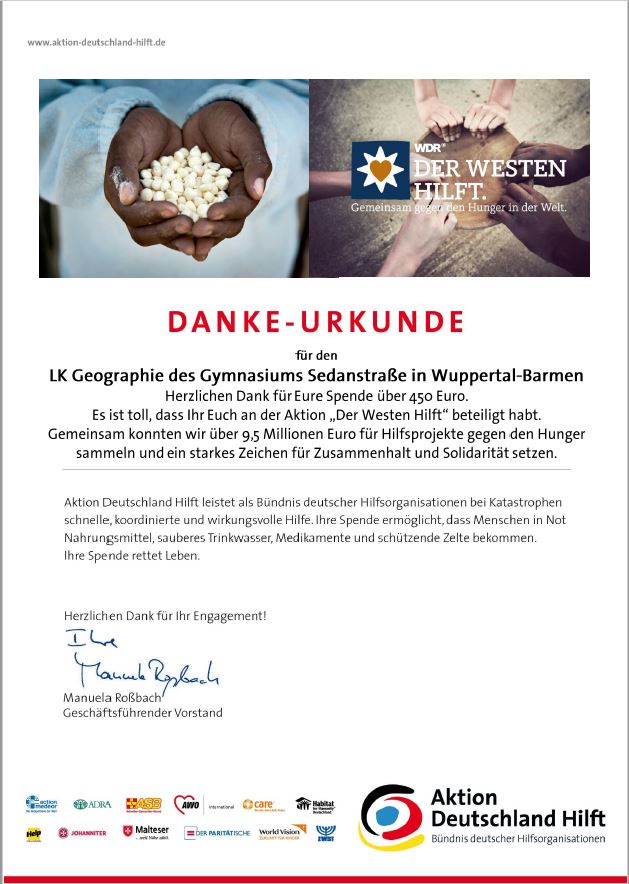 Der Geographie LK der Jahrgangsstufe Q1 freut sich über ein großartiges vorweihnachtliches Spendenergebnis von insgesamt 450 €. Wir bedanken uns für jede kleine und auch größere Spende, die den Menschen, die aktuell auf der gesamten Welt an Hunger leiden und in Not sind, hilft.