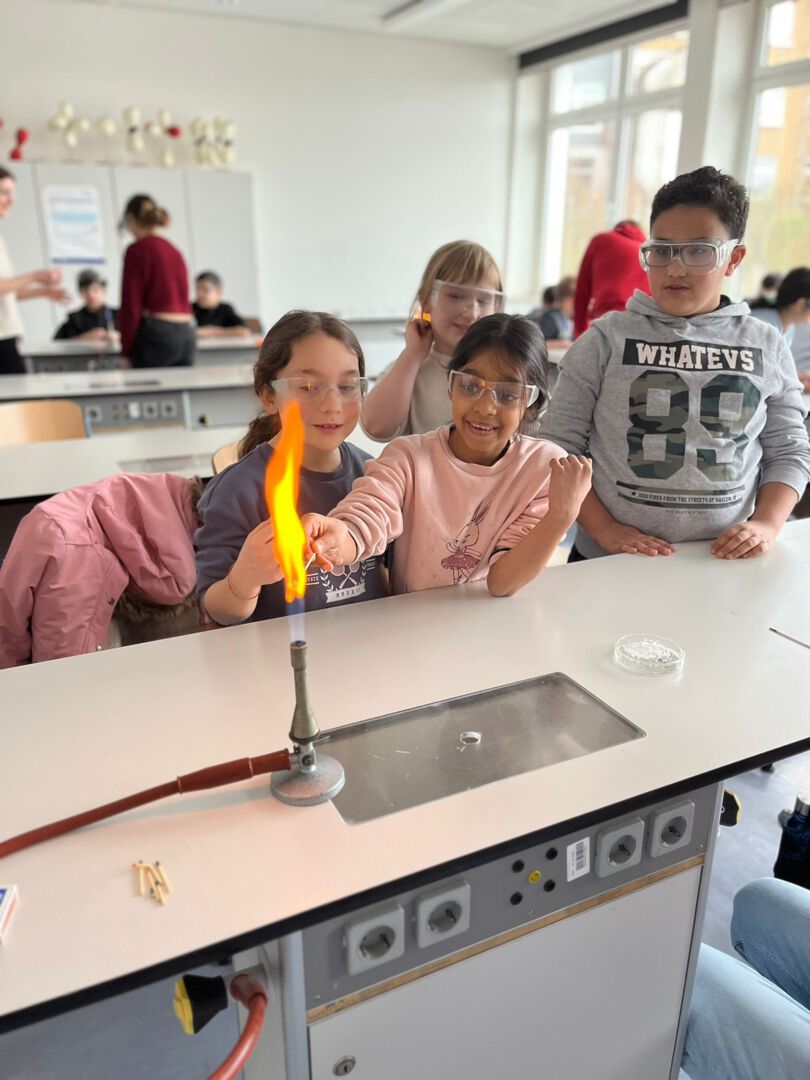 Mit der Unterstützung durch Schülerinnen und Schülern aus der Q2 haben die Kinder Flammen gefärbt, einen eigenen Feuerlöscher gebaut und sind der Frage nachgegangen, welche unterschiedlichen Materialien brennbar sind. Die Kleinen waren sehr begeistert und kommen gerne wieder.