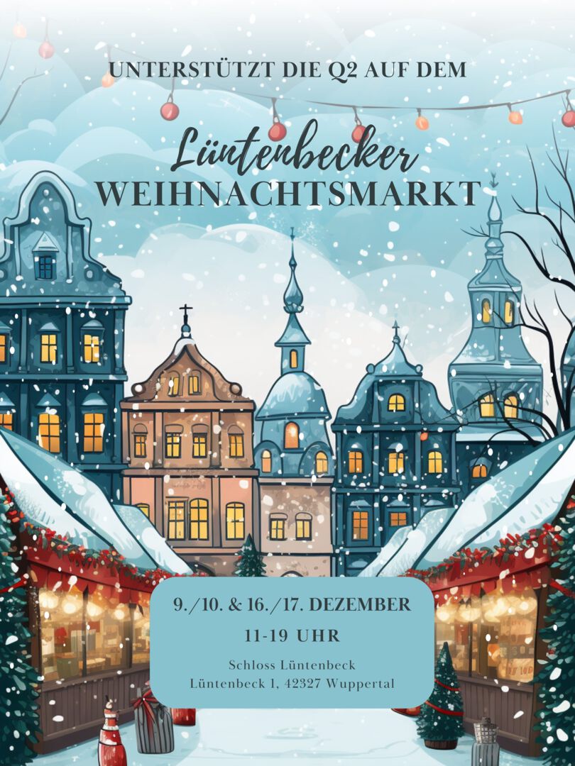 Auch in diesem Jahr ist die Q2 auf dem Lüntenbecker Weihnachtsmarkt am 9./10. und 16./17. Dezember jeweils von 11-19 Uhr vertreten. Dort werden neben selbstgebackenen Nussecken und Weichnachtskeksen auch unser Sedan-summt-Honig verkauft. Wir freuen uns, Sie und euch auf dem Weihnachtsmarkt zu treffen!