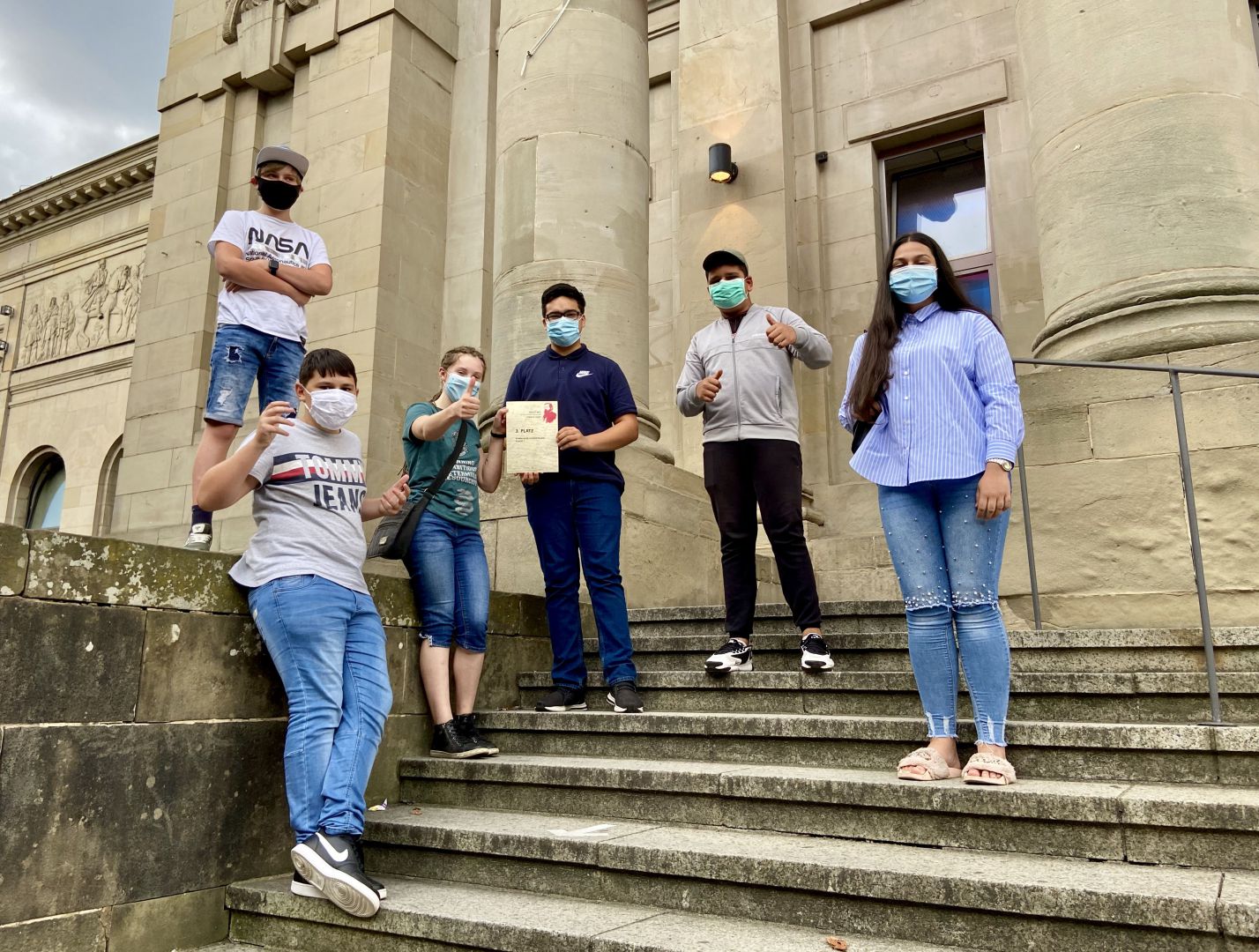 Preisverleihung zum Engels Schülerwettbewerb Im Februar hat unsere Klasse (7d, jetzt 8d) an einem Workshop teilgenommen, zu dem eine Autorin (Christine Gibiec) zu uns in die Schule kam und wir haben zusammen über ihr Buch „Türkischrot“ geredet und an einer Schreibwerkstatt teilgenommen. Wir haben Texte geschrieben und diese zum Wettbewerb „Wer war Friedrich Engels?“ des Historischen Zentrums Wuppertal eingereicht. Nun haben wir den dritten Platz beim Schülerwettbewerb erreicht und einen tollen Geldpreis für unsere Klassenkasse gewonnen. Es war echt ein tolles Erlebnis!