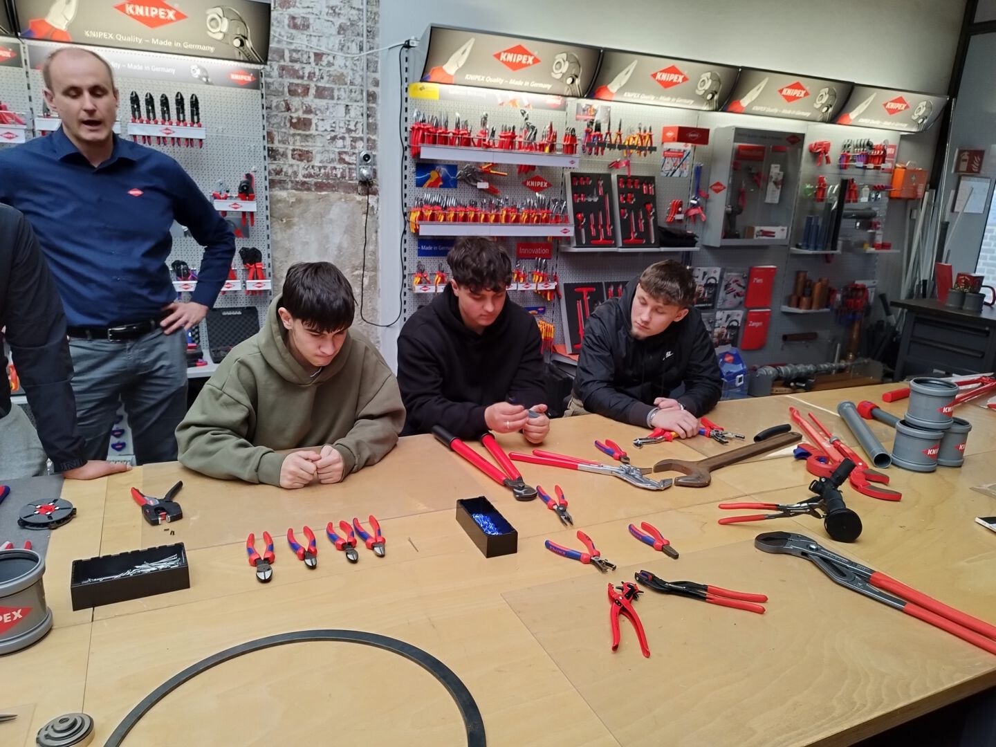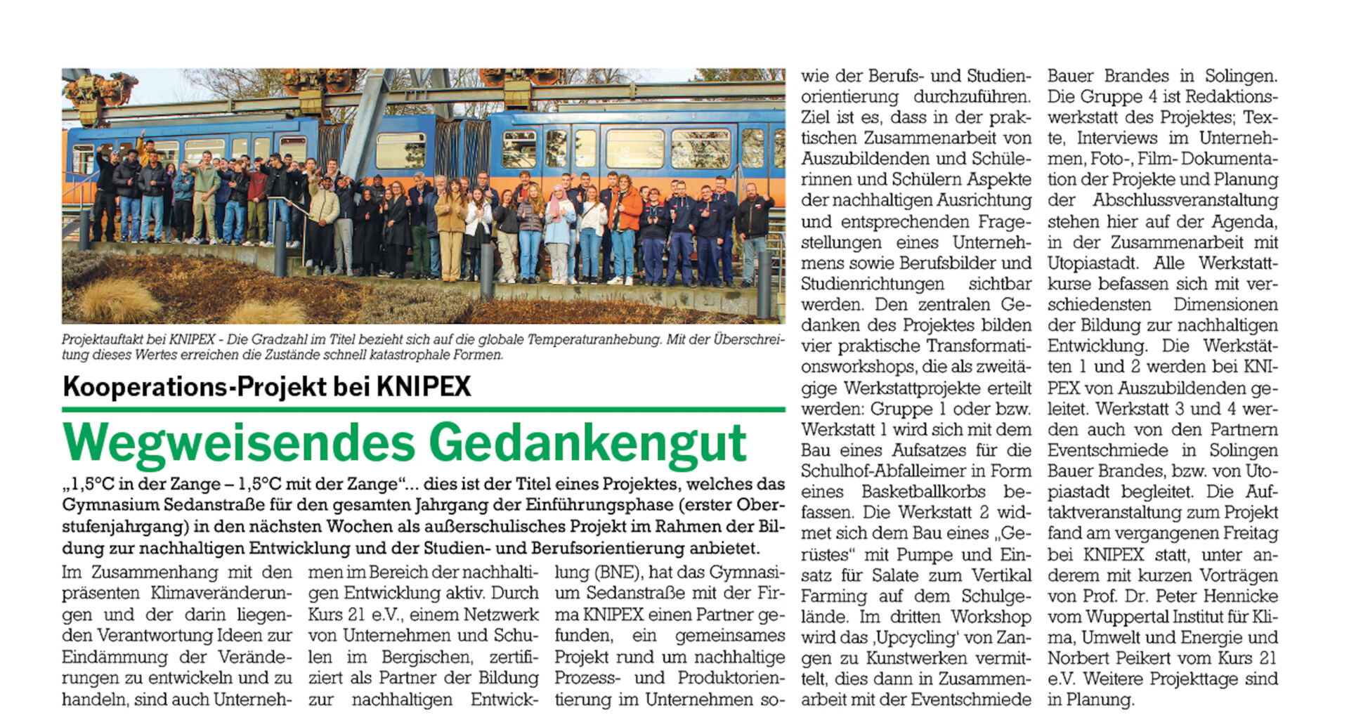 Seit diesem Schuljahr kooperiert unser Gymnasium mit dem Wuppertaler Traditionsunternehmen KNIPEX, einem der führenden Spezialisten für Profi-Zangen. Dass es dort weitaus mehr als nur diese Zangen zu entdecken gibt, können die Schülerinnen und Schüler der Einführungsphase in vier Transformationsworkshops erfahren. Über die Auftaktveranstaltung berichtete zum Beispiel der Cronenberger Anzeiger: