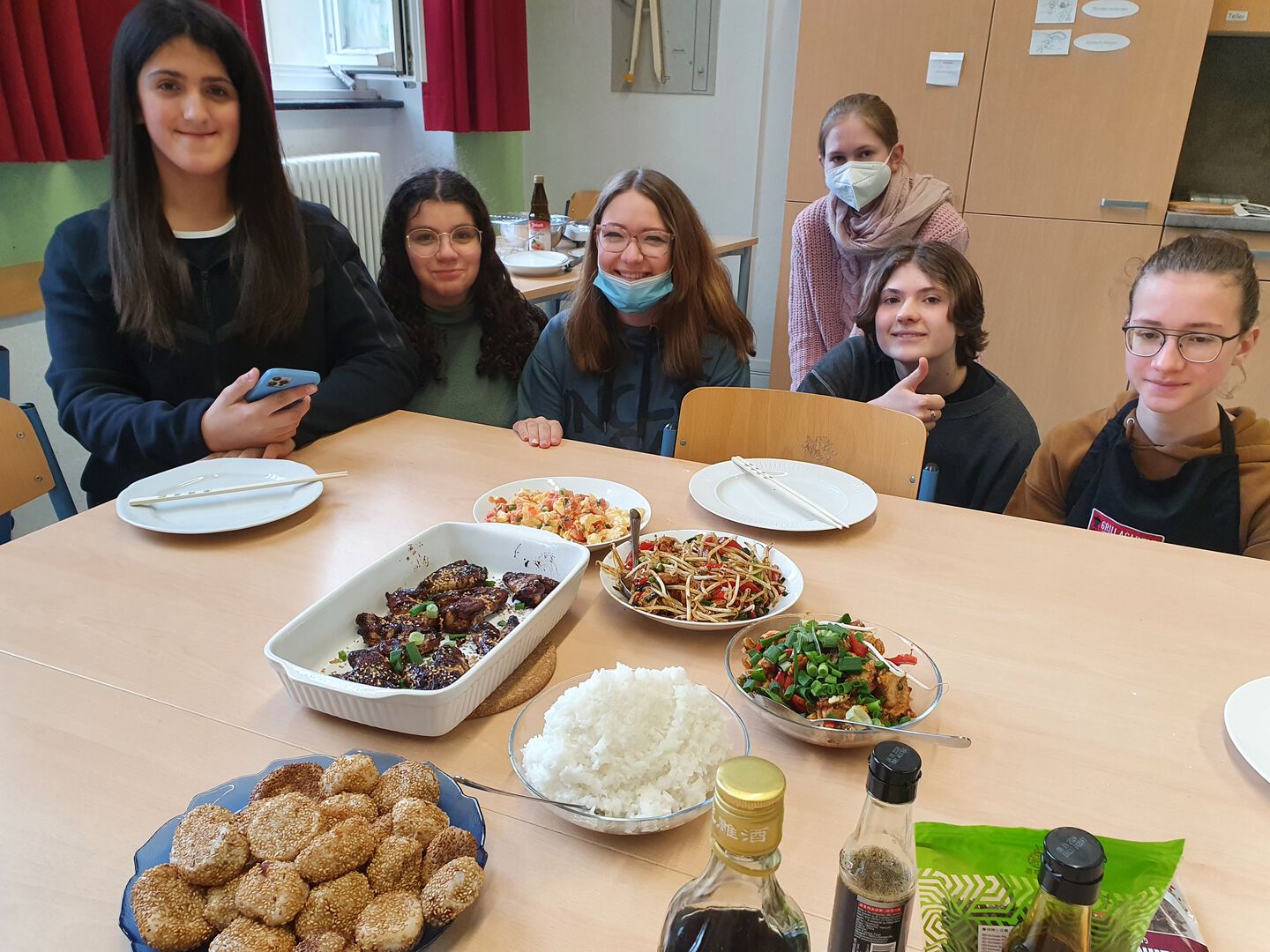 Dank eines Besuches im Asialaden konnten auch die exotischsten Zutaten erworben werden, und die Show konnte beginnen. Zunächst wurden gruppenweise die Rezepte studiert und die Zutaten zusammengesucht. Zwischen bekannten Zutaten wie Hühnchen, Eiern, Knoblauch und Paprika, fanden sich auch unbekannte Produkte, zum Beispiel Reiswein, Sternanis und verschiedenen Sojasaucen. Unerschrocken und souverän schnippelten, marinierten, frittierten und schmorten die teilnehmenden Schülerinnen und Schüler und schafften es in kürzester Zeit, die authentischen Gerichte auf die Teller zu bringen.