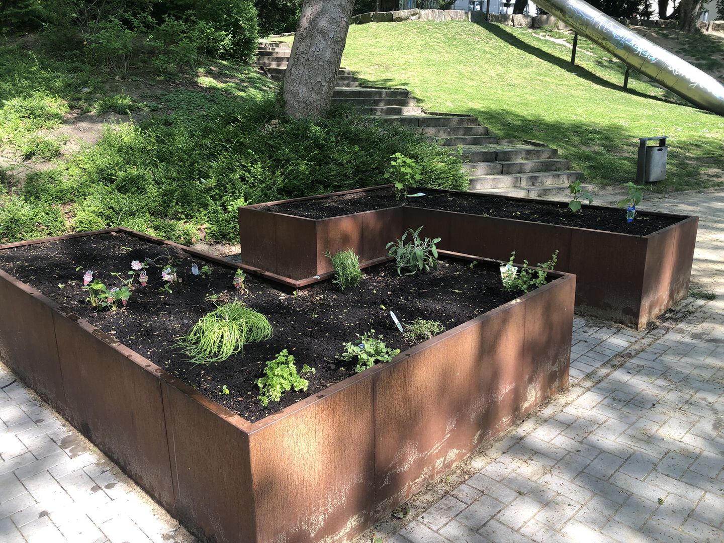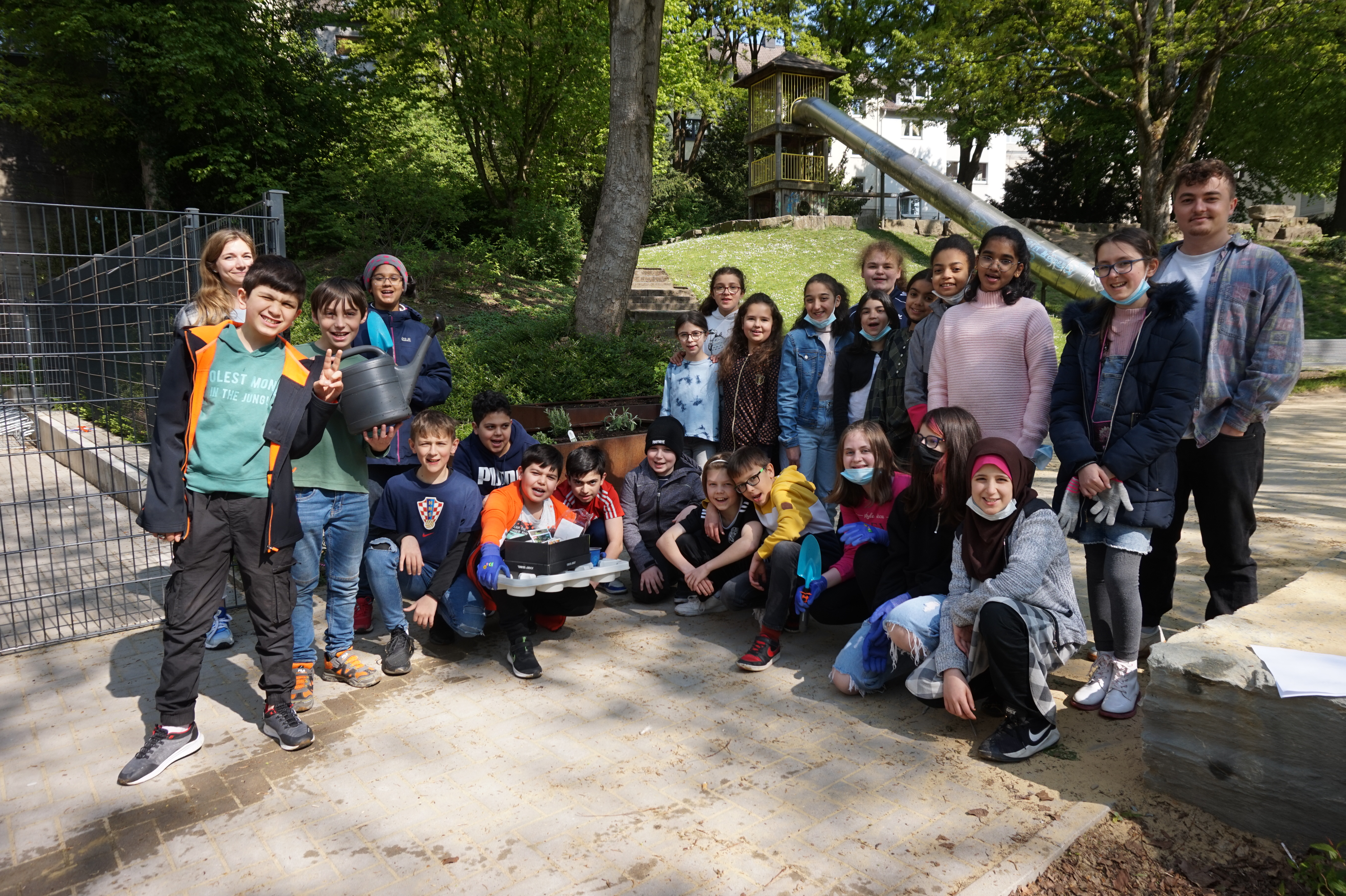 Die Beete auf dem Spielplatz hinter dem Schulhof sind letzte Woche mit Erdbeeren, Salbei, Oregano, Johannisbeeren und einigem mehr bepflanzt worden. Dabei hat die Klasse 5a im Biologieunterricht die Schaufeln geschwungen. Die Pflege der Beete wird durch die in Kürze entstehende Urban Gardening AG übernommen, die sich zusätzlich mit den Pflanzen und deren Nutzung beschäftigt.