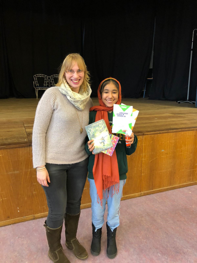 Am 6.12. traten die Gewinner in der Aula vor all ihren Mitschülerinnen und Mitschülern an. Die Aufregung war bei allen groß – allerdings vollkommen unbegründet, denn jeder las seinen selbst mitgebrachten Text großartig vor. Die Jury, bestehend aus den drei Deutschlehrerinnen Frau Horst (6a), Frau Graf-Greger (6b) und Frau Schulte (6c) und unserer Hausmeisterin Frau Müller, die bereits bei Sedan sucht den Superstar Juryerfahrung sammeln konnte, war insbesondere von der gelungen, teilweise sehr anspruchsvollen Literaturauswahl der Sechstklässler beeindruckt. Auch den zweiten Teil des Wettbewerbs, das Lesen eines fremden Textes, leisteten alle souverän, sodass die Jury eine schwierige Entscheidung zu fällen hatte. Am Ende stand Oda Amirie aus der 6a als Siegerin fest, die sich nun in der nächsten Runde mit weiteren Siegern aus Wuppertal messen darf.